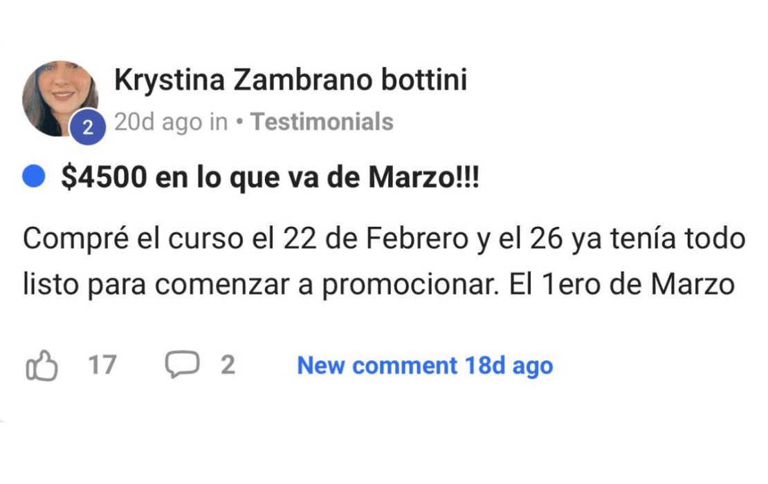 Tendrás acceso a la comunidad del curso donde se realizan llamadas por Zoom 2 veces por semana para aclarar dudas y dar tips valiosos